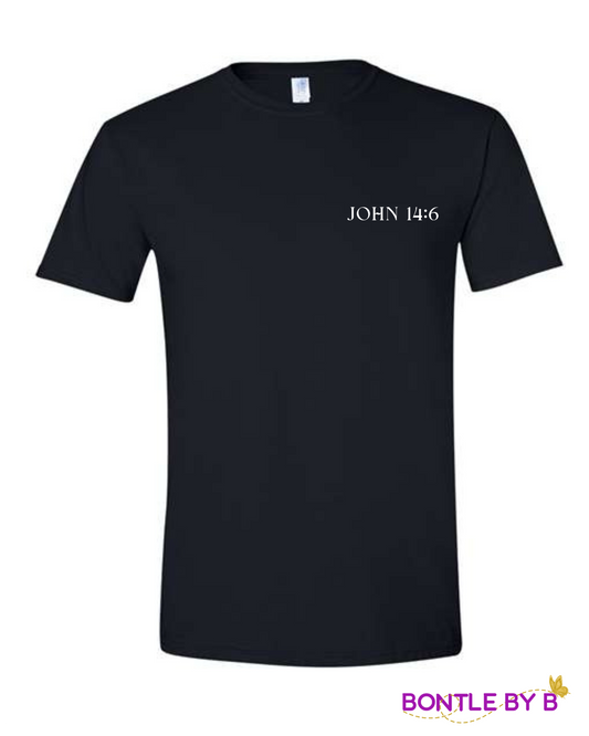 Black Christian Tee – John 14:6 “Jesus The Way, Truth, Life” Cross Design