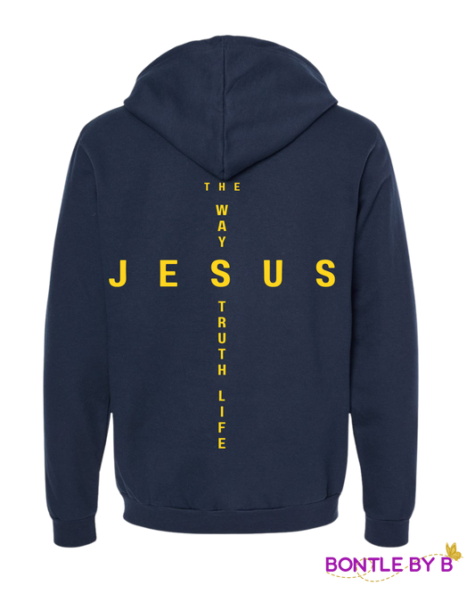 Navy Blue Christian Zip-Up Hoodie – John 14:6 “Jesus The Way, Truth, Life” Cross Design in Yellow