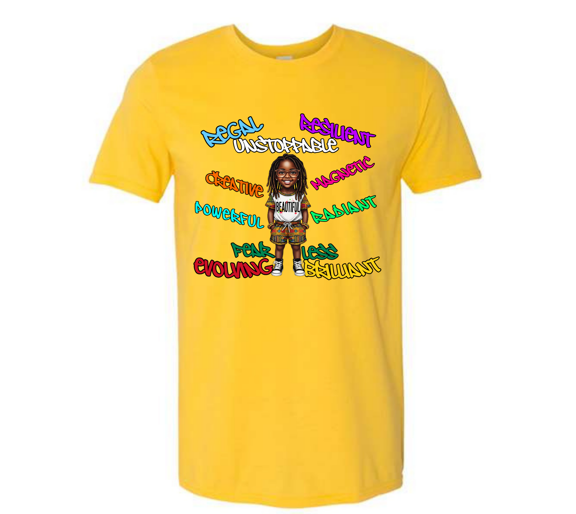 Let her shine from the inside out with our Girls’ Empowerment Tee – “Beautiful & Bold”. This yellow T-shirt features a vibrant cartoon girl wearing a “BEAUTIFUL” shirt, surrounded by colorful affirmations like Resilient, Radiant, Fearless, and Brilliant. It’s designed to inspire confidence, creativity, and pride in every young girl who wears it.
