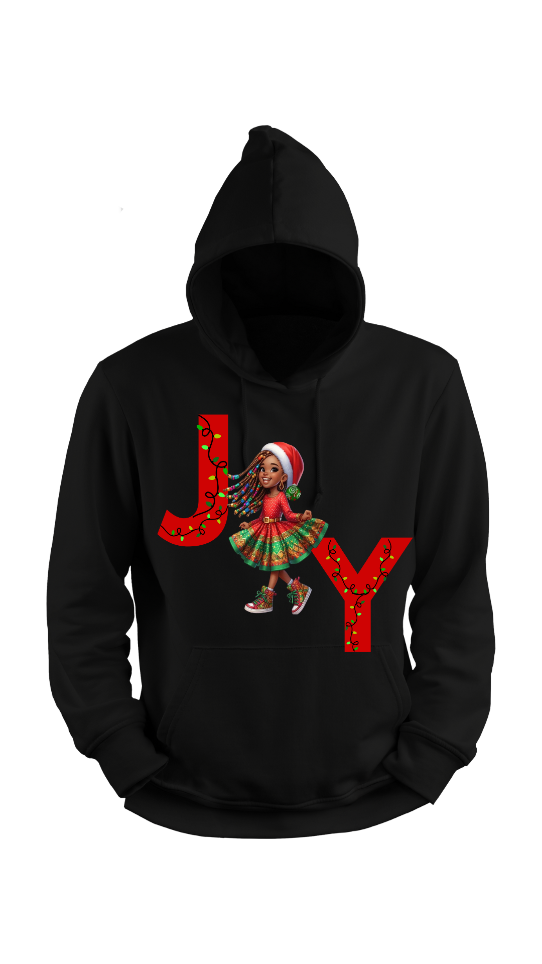 Spread holiday cheer with this delightful Christmas hoodie featuring a joyful Black girl character wearing a festive Santa hat, beautifully positioned between decorative "JOY" letters adorned with twinkling Christmas lights. The design celebrates Black girl magic while embracing the warmth of the holiday season.