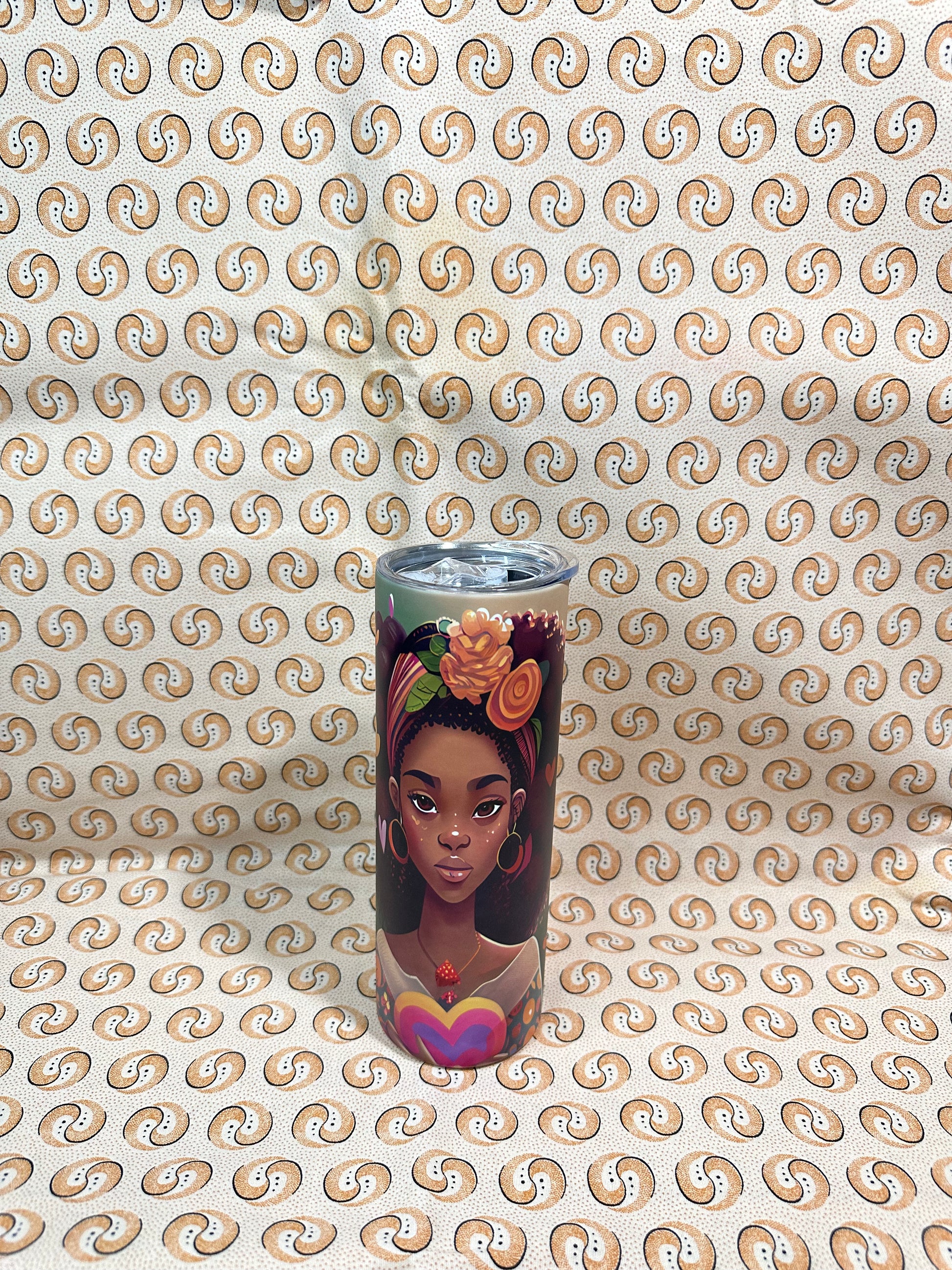 Black girl magic written on one side in multi colour and gold with black girl with hearts around her.
