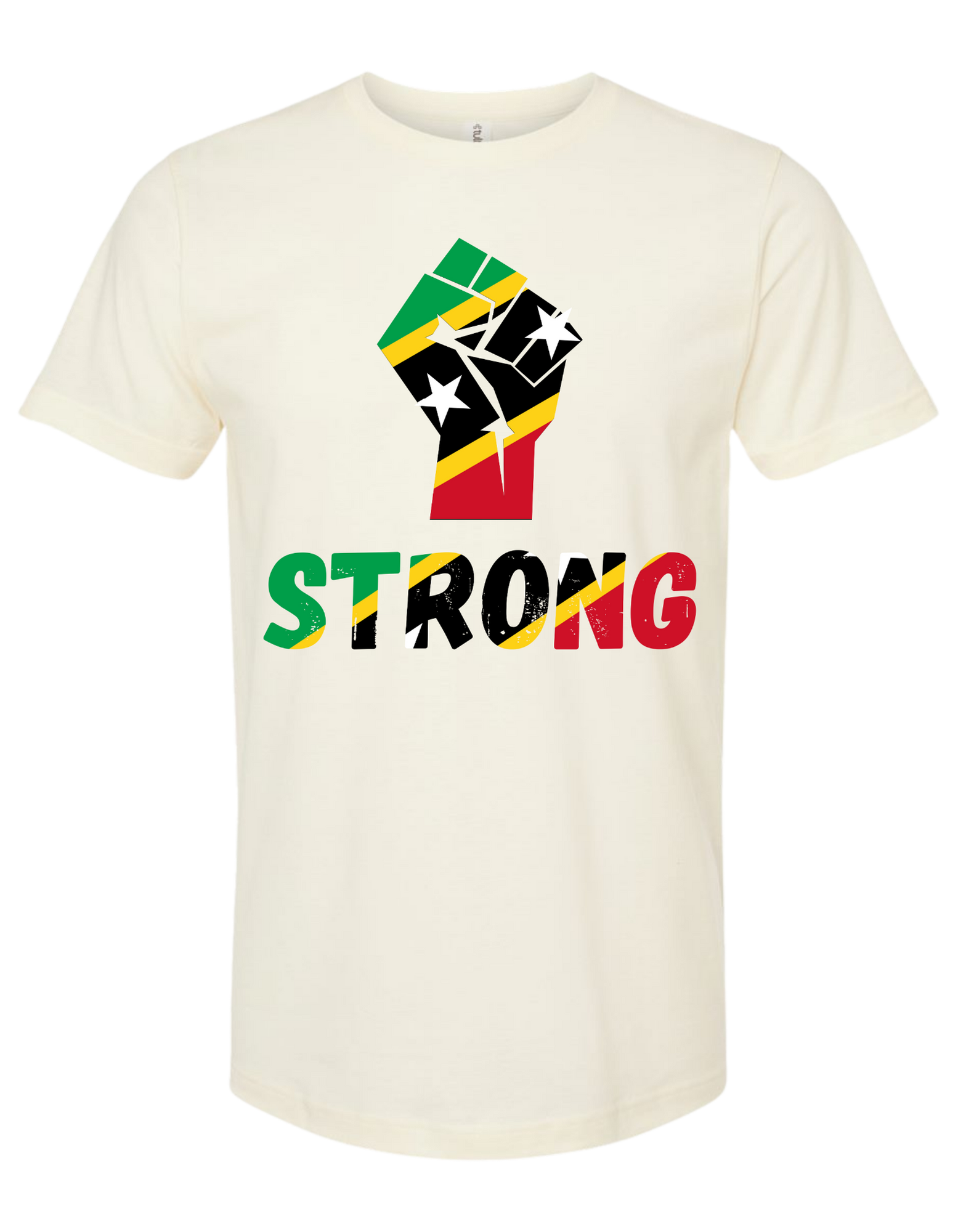 Show your strength, culture, and pride with our St. Kitts & Nevis Strong T-Shirt. Featuring a bold raised fist filled with the Kittitian & Nevisian flag design and the word STRONG in green, red, yellow, black, and white, this shirt is the perfect way to represent your roots.